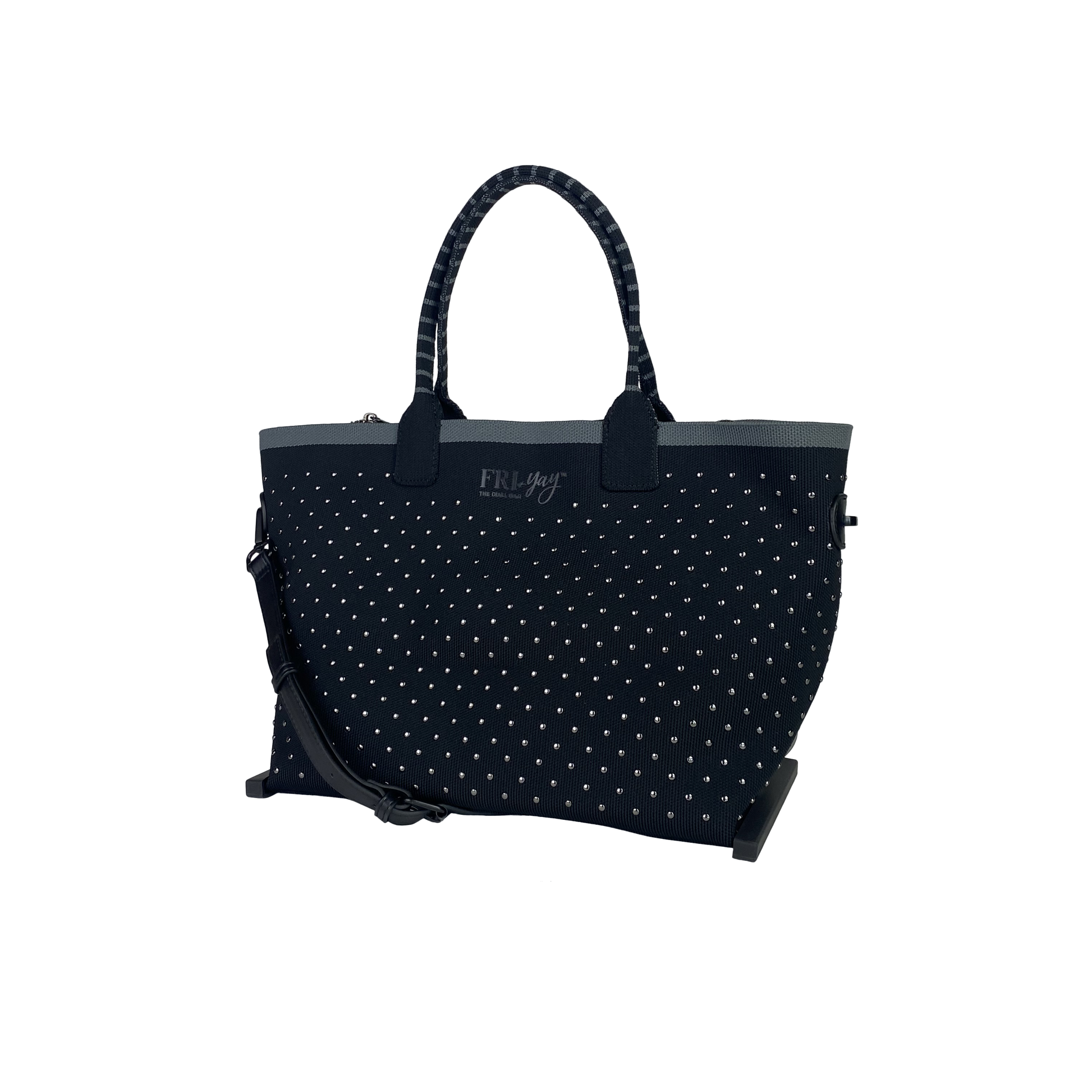 Black saffiano handles, bottom, side shoulder strap attachments and phone pocket details