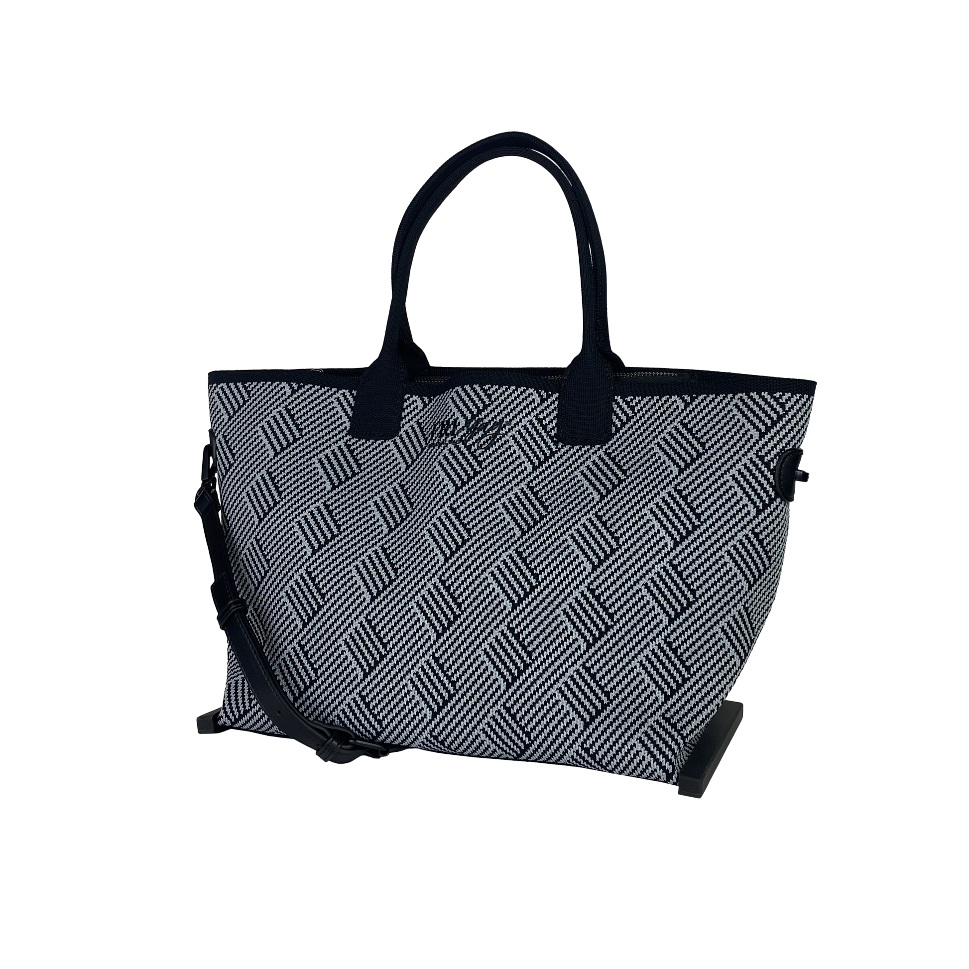 Black saffiano handles, bottom, side shoulder strap attachments and phone pocket details