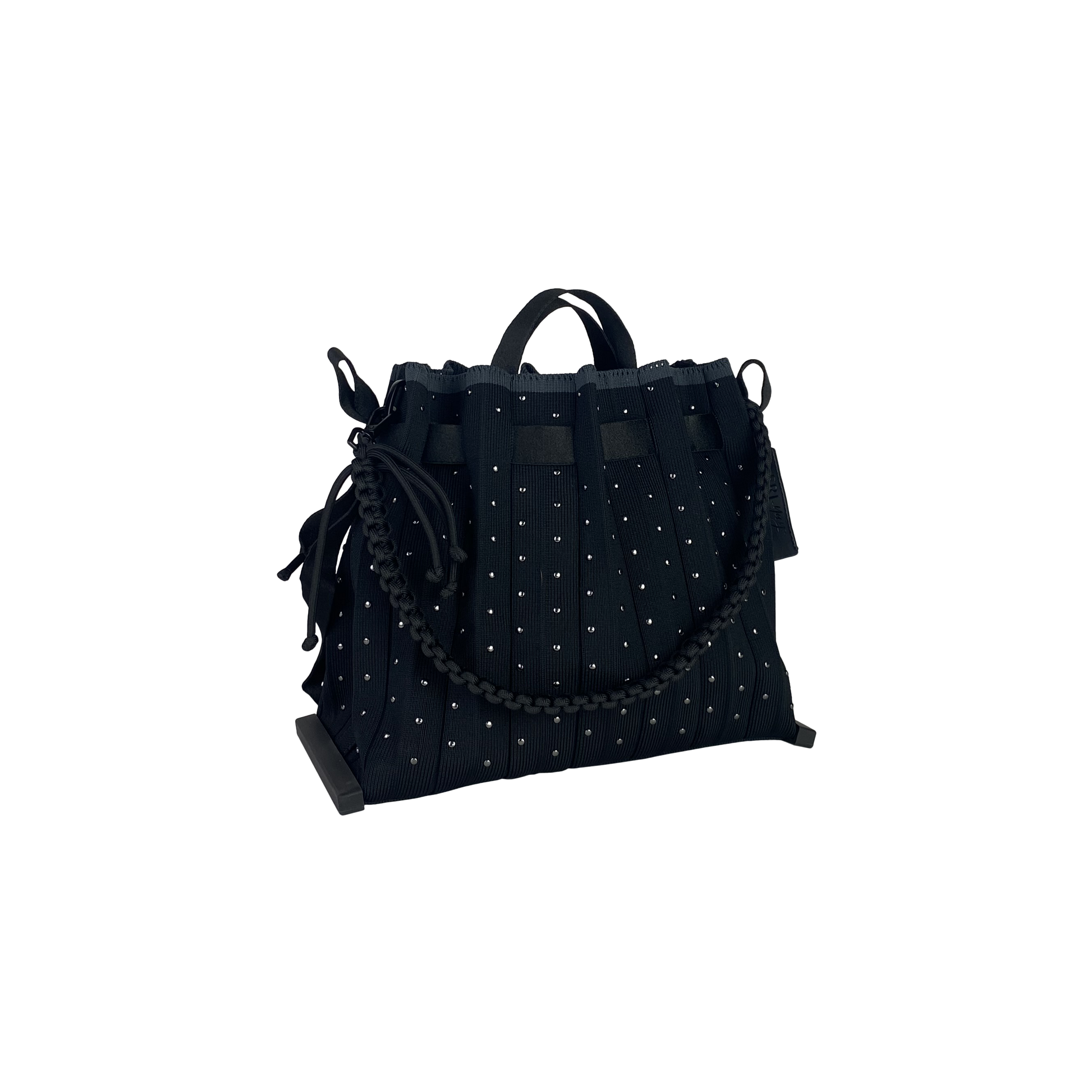 Pleated stitch knit bucket bag with drawstring closure, braided rope shoulder with snap hooks, adjustable eco leather shoulder strap with buckle 100-110 cm long (included)