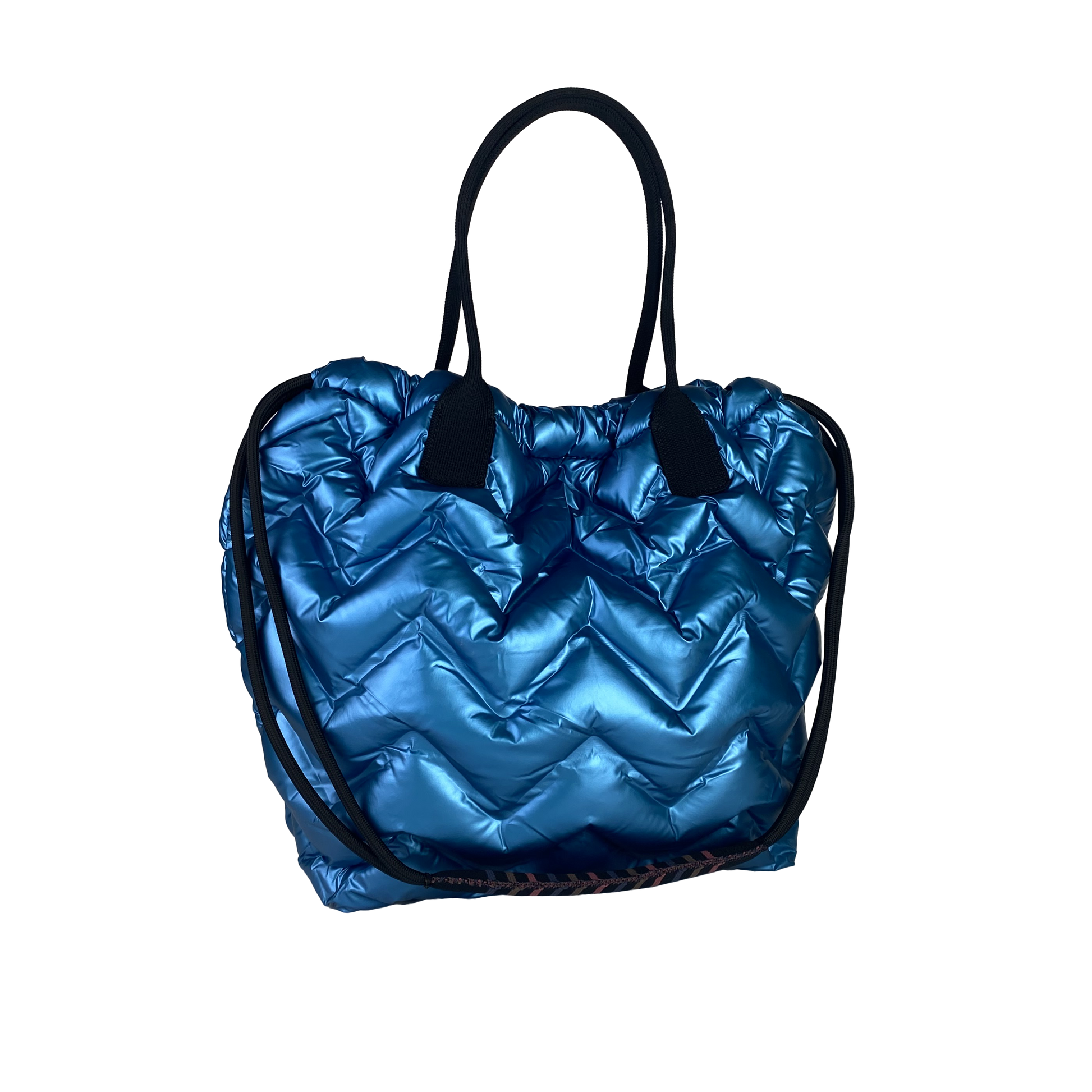 La Sveva è una borsa dallo stile contemporaneo, caratterizzata da un design morbido e voluminoso grazie alla speciale lavorazione termosaldata che crea un motivo a zig-zag. Realizzata in tessuto effetto piumino, combina leggerezza, resistenza e un look moderno e brillante. I manici in maglia aggiungono comfort, stabilità e un tocco di originalità, rendendola perfetta per l’uso quotidiano.