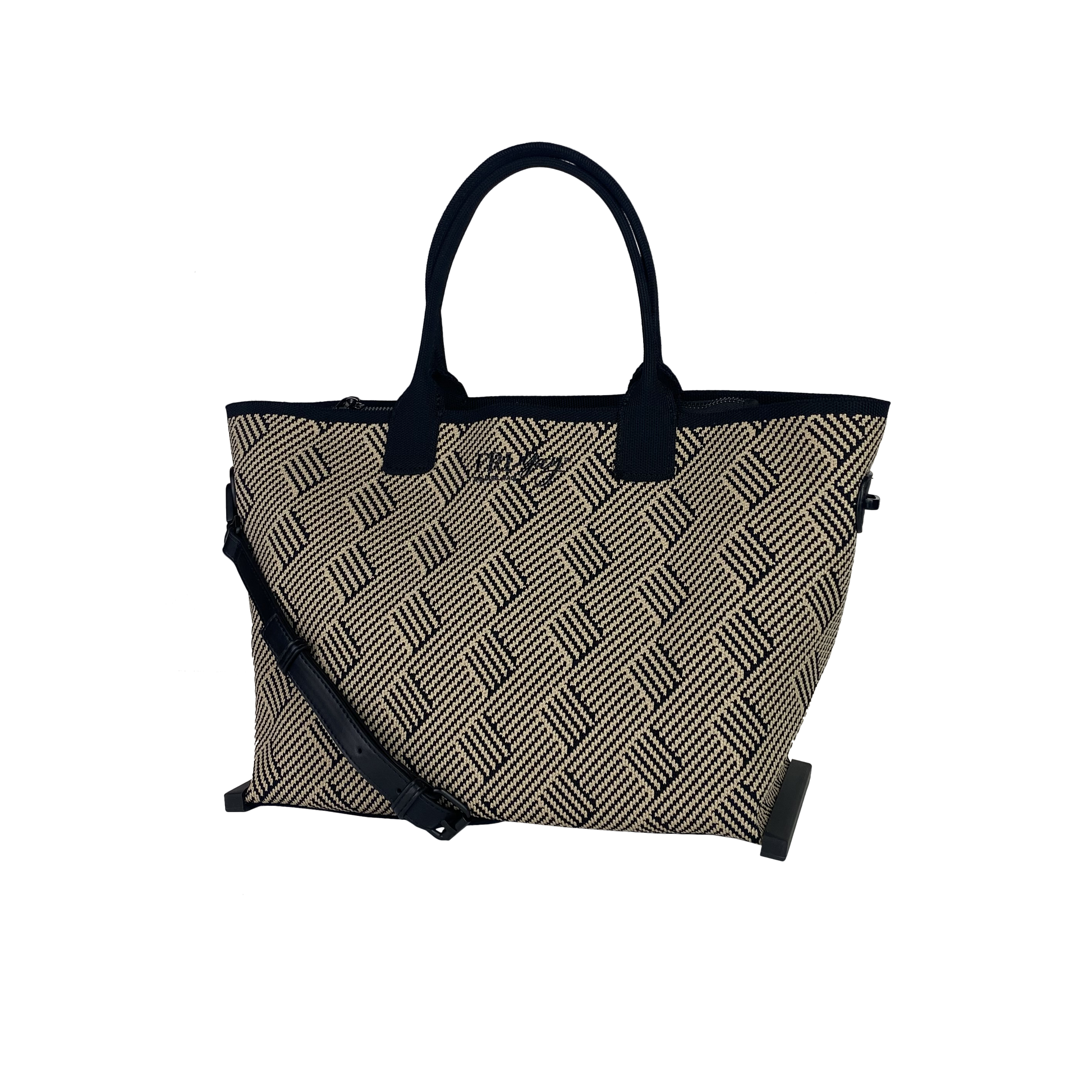 Dettagli manici, fondo, attacchi tracolla laterali e tasca porta telefono in maglia nera
