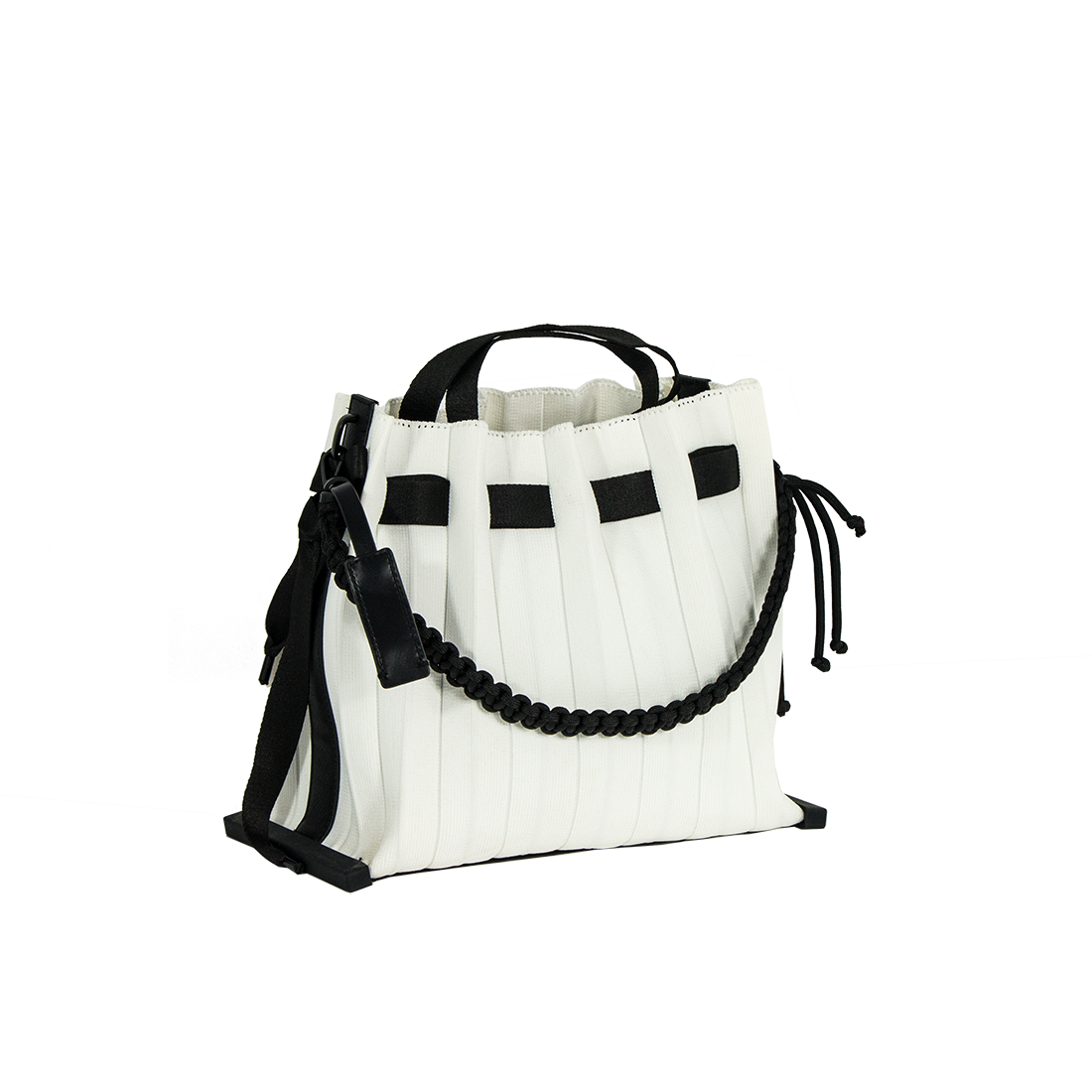 Borsa a secchiello in maglia a punto plissé con chiusura coulisse, spallotto in corda intrecciata con moschettoni, tracolla in eco pelle regolabile con fibbia lunga 100-110 cm (inclusa)